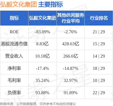 弘毅文化集团港股市值8.83亿港元,在其他休闲服务行业中排名第15。主要指标见下表:
