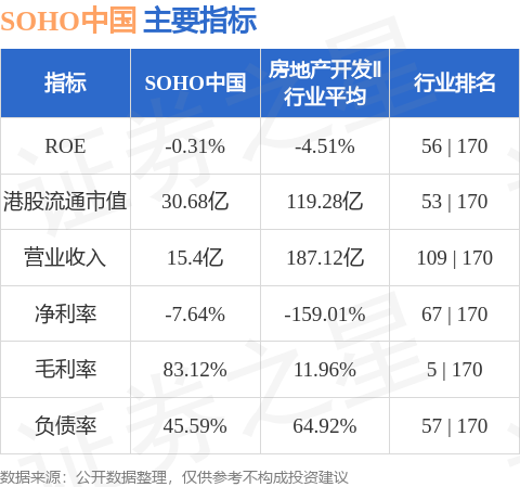 SOHO中国港股市值30.68亿港元,在房地产开发Ⅱ行业中排名第53。主要指标见下表: