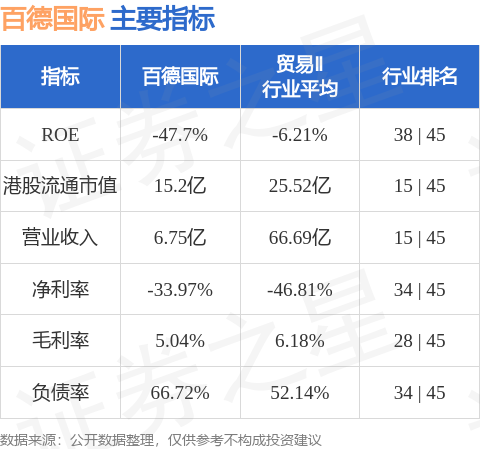 百德国际港股市值15.2亿港元,在贸易Ⅱ行业中排名第15。主要指标见下表: