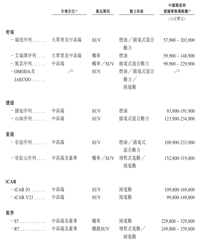 公司的五大品牌为奇瑞、捷途、星途、iCAR和智界,每个主要品牌都有独特的定位、出行风格和审美认知,满足不同客户需求,并覆盖各具增长潜力的细分赛道。