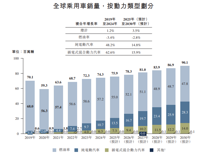 据弗若斯特沙利文(Frost & Sullivan)的资料,按动力类型划分,2024年,燃油车的销量减少到57.2百万辆,而纯电动汽车及插电式混合动力汽车的销量分别增加到10.7百万辆及6.3百万辆,对应市场份额分别为77.0%、14.5%及8.5%;新能源汽车占比有望持续提高,2030年市场份额预计达到47.0%。