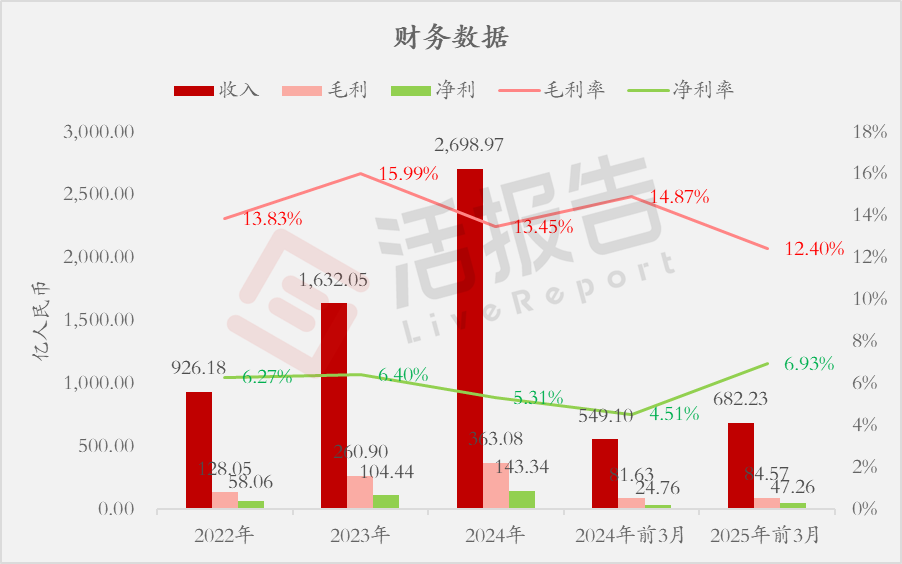 收入分别约为人民币926.18亿、1632.05亿、2698.97亿、549.10亿、682.23亿,2025年前3月同比+24.25%;