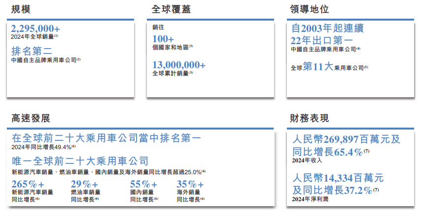 于2024年,公司是全球前二十大乘用车公司中唯一一家新能源汽车销量、燃油车销量、中国市场销量及海外市场销量较2023年均增长超过25.0%的乘用车公司;于2024年,公司的乘用车销量较2023年增长49.4%,增速位居全球前二十大乘用车公司之首,有八款车型的平均月销量超过10,000辆。