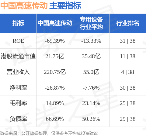 中国高速传动港股市值21.75亿港元,在专用设备行业中排名第11。主要指标见下表: