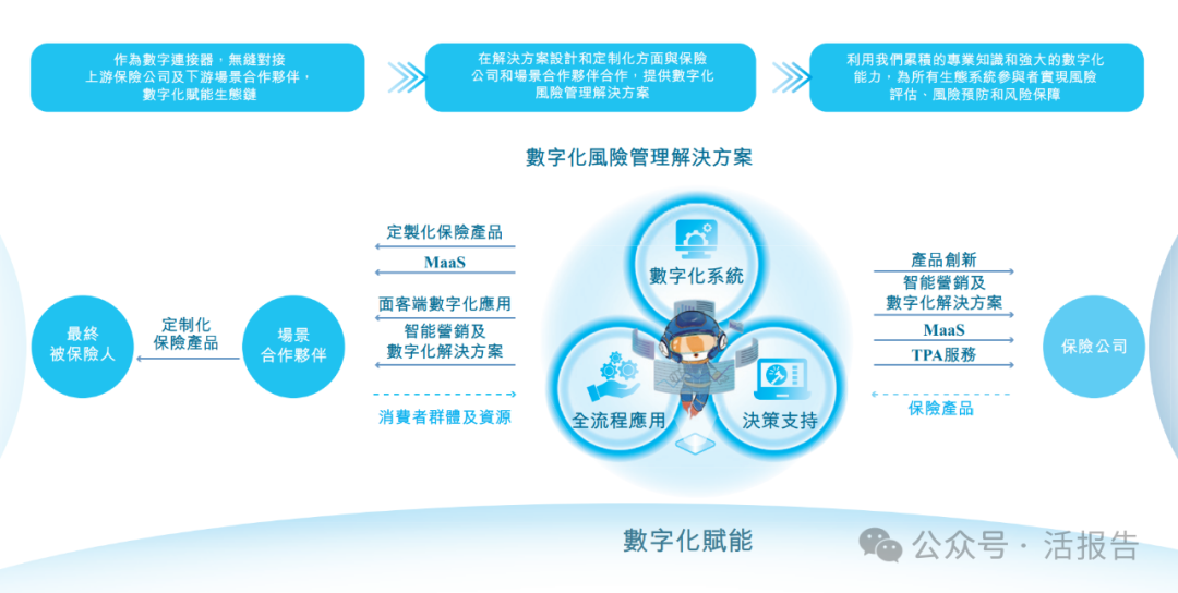公司采取主动的方式,激发、识别及发掘不同场景下的风险管理需求,并促进保险公司与其他生态系统合作伙伴之间的对话,让保险公司对风险管理需求有更精确的了解。公司的收入主要来自:(i)保险交易服务,公司就协助保险公司成功交付由其承保的保险产品向其收取佣金;(ii)精准营销及数字化解决方案,包括各企业支付的项目费用;及(iii)主要由保险公司支付的TPA服务费。