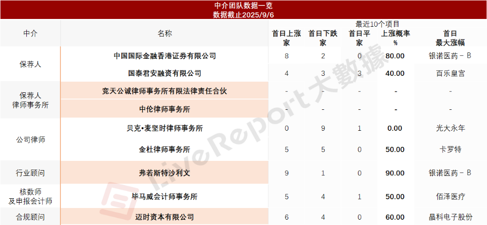中介团队共9家,其中保荐人2家,近10家保荐项目数据表现一般;公司律师共计2家,综合项目数据表现有待改进。整体而言中介团队表现平平无奇。