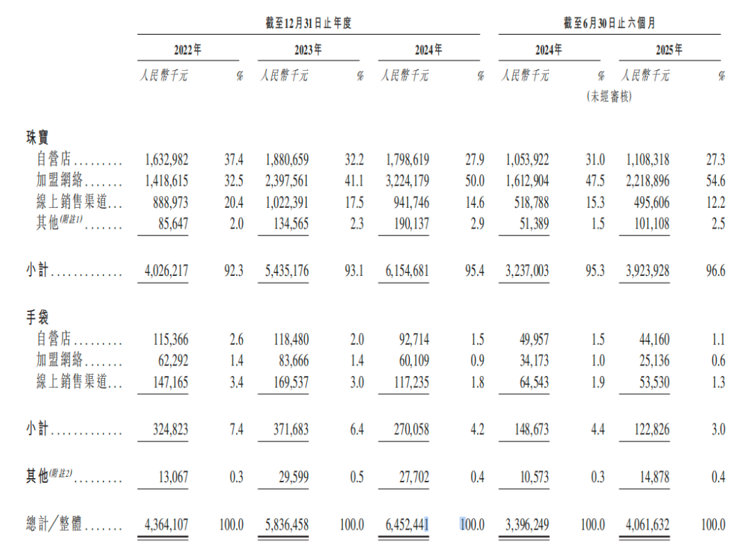 公司近年来营收稳定增长,毛利相对营收增长较缓,2024年毛利率相较2022年下降了近7个百分点,主要源于加盟渠道销售的珠宝占比增加。