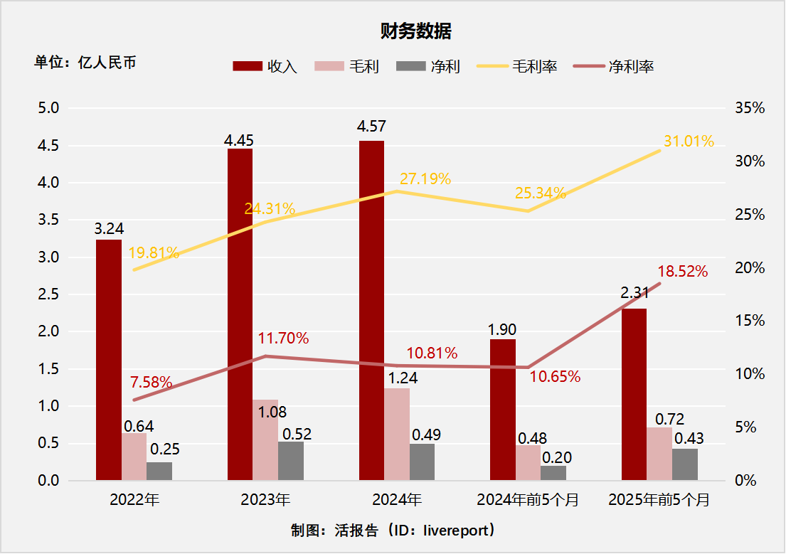 公司是中国领先的贵金属手表设计商、制造商和品牌拥有人。2024年公司收入4.57亿元,净利润0.49亿元(年复合增长41.8%),2025年前5个月收入2.31亿元,净利0.43亿元。