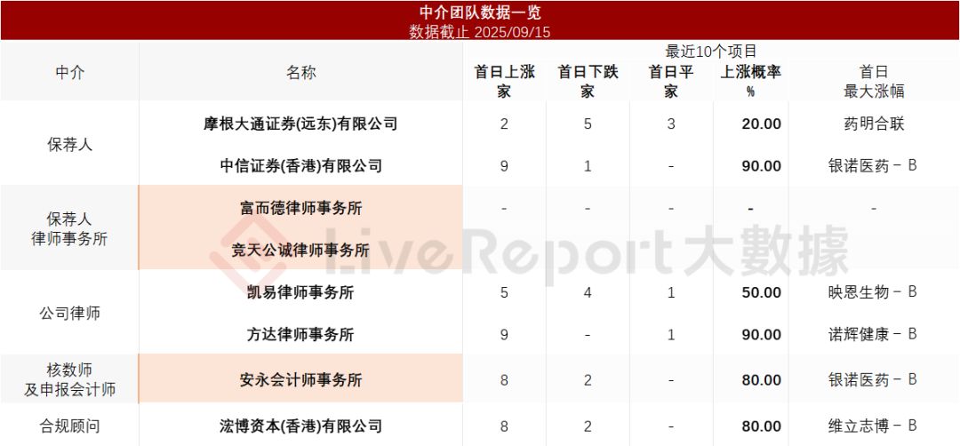 据LiveReport大数据统计,爱科百发中介团队共计8家,其中保荐人2家,保荐项目数据表现整体一般;公司律师2家,综合项目数据整体一般。整体而言中介团队历史数据整体表现普通。