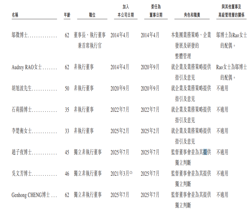 公司董事高层由1位执行董事、4位非执行董事及3位独立非执行董事组成,其中邬征博士为公司董事长、执行董事兼首席执行官,其主要负责公司的业务策略、企业发展及研发的整体管理。