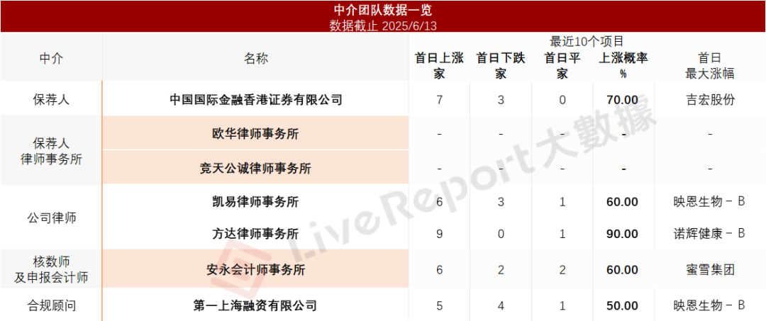 据LiveReport大数据统计,轩竹生物中介团队共计7家,其中保荐人1家,近10家保荐项目数据表现较好;公司律师共计2家,综合项目数据尚可。整体而言中介团队历史数据表现中等。