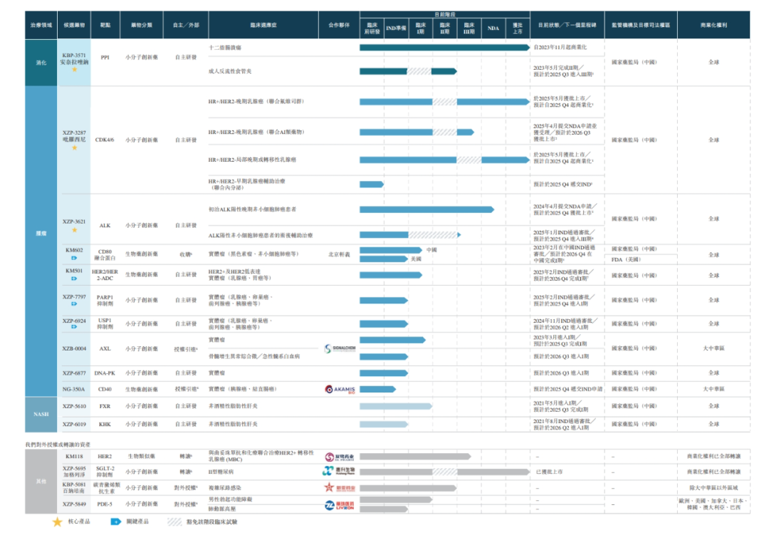 公司有三款核心产品,即KBP-3571(已获NDA批准的治疗消化系统疾病的创新质子泵抑制剂(PPI))、XZP-3287(已获NDA批准的靶向乳腺癌的细胞周期蛋白依赖性激酶4/6(CDK4/6)抑制剂)和XZP-3621(已提交NDA的靶向非小细胞肺癌(NSCLC)的间变性淋巴瘤激酶(ALK)抑制剂)。这种管线设计从战略上平衡了开发风险和创新,使公司的商业化或后期资产能够支持公司早期创新药物的开发。