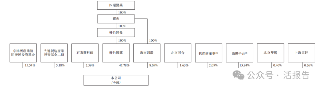 四环医药(0460.HK)通过轩竹医药、海南四环分别持股47.78%、8.69%,合计56.47%;激励平台持股15.84%;
