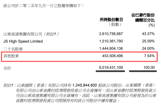 根据证监会查讯结果显示,山高控股于2025年9月1日,有二十名股东合共持有1,444,804,136股该公司股份,相当于该公司已发行股本之24.00%。有关股权连同由两名该公司的主要股东持有之4,121,118,477股(占已发行股本之68.46%),相当于该公司已发行股本之92.46%。因此,该公司只有453,508,496股(占已发行股本之7.54%)由其他股东持有。