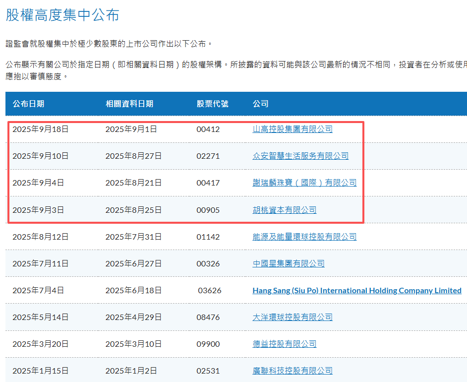 今年9月,香港证监会(SFC)连续公布4家“股权高度集中”公司,分别为谢瑞麟(0417.HK)、胡桃资本(0905.HK)、众安智慧生活(2271.HK)、山高控股(0412.HK)。