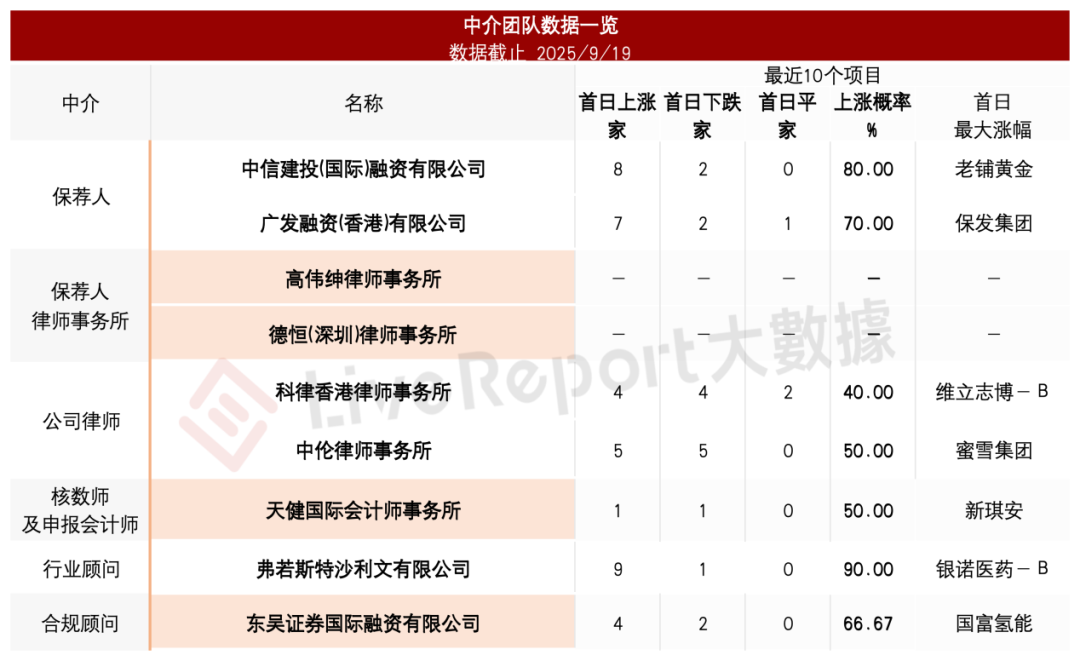 据LiveReport大数据统计,若羽臣中介团队共计9家,其中保荐人2家,近10家保荐项目数据表现尚可;公司律师共计2家,综合项目数据表现欠佳。整体而言中介团队历史数据表现一般。