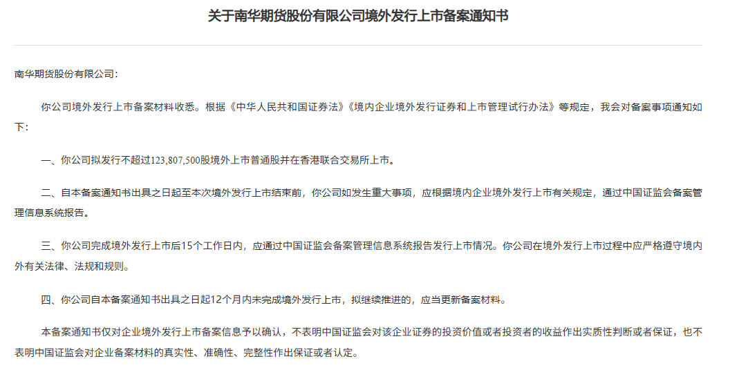 南华期货于9月19日通过备案,拟发行不超过123,807,500股境外上市普通股并在香港联合交易所上市。