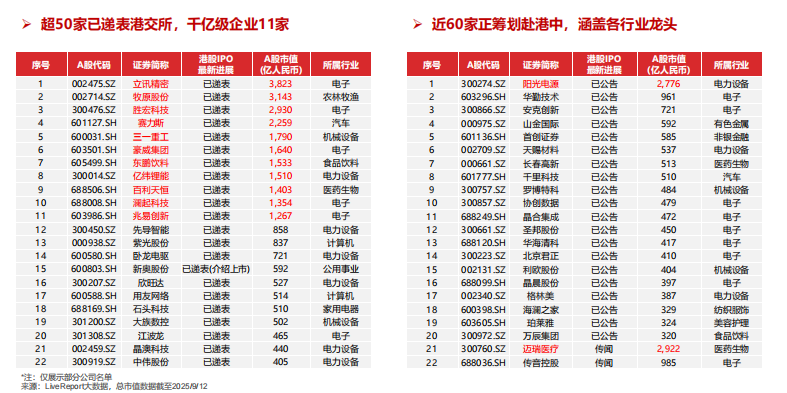 目前已有超50家A股企业递表港交所和近60家企业正在筹划上市,其中涵盖各行业龙头。