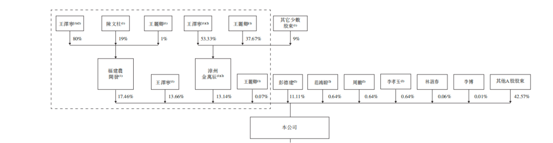 公司已发行股本总额分别由福建农开发、漳州金万辰、王泽宁先生及王丽卿女士分别持有约17.46%、约13.14%、约13.66%及约0.07%。福建农开发由王泽宁先生、陈文柱先生及王丽卿女士分别持有80.00%、19.00%及1.00%。王泽宁先生、王丽卿女士及多名其他少数股东分别合共持有漳州金万辰约53.33%、37.67%及约9.00%。