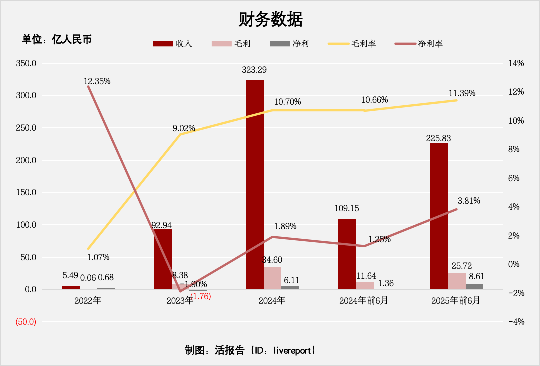 毛利分别约为人民币0.06亿元、8.38亿元、34.6亿元、11.64亿元及25.72亿元,年复合增长率为2329.62%;