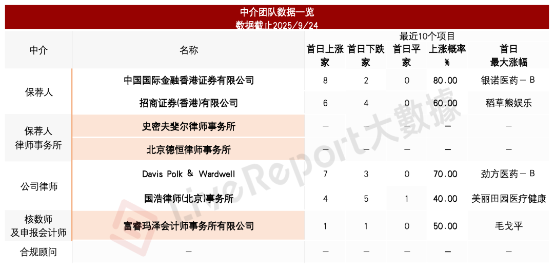 据LiveReport大数据统计,万辰生物中介团队共7家,其中保荐人2家,近10家保荐项目数据表现良好;公司律师共计2家,综合项目数据表现尚可接受。整体而言中介团队表现中规中矩。