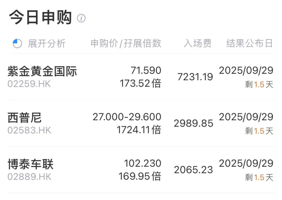 紫金黄金国际孖展认购173.52倍,西普尼孖展认购1724.11倍,博泰车联孖展认购169.95倍