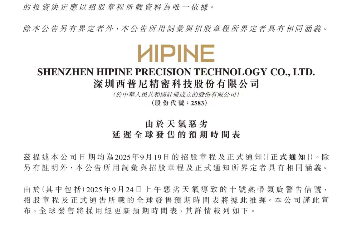 原定9月29日上市的两只新股紫金黄金国际(2259.HK)、西普尼(2583.HK)均已发布公告,因恶劣天气导致极端情况,上市日期将推迟至9月30日。