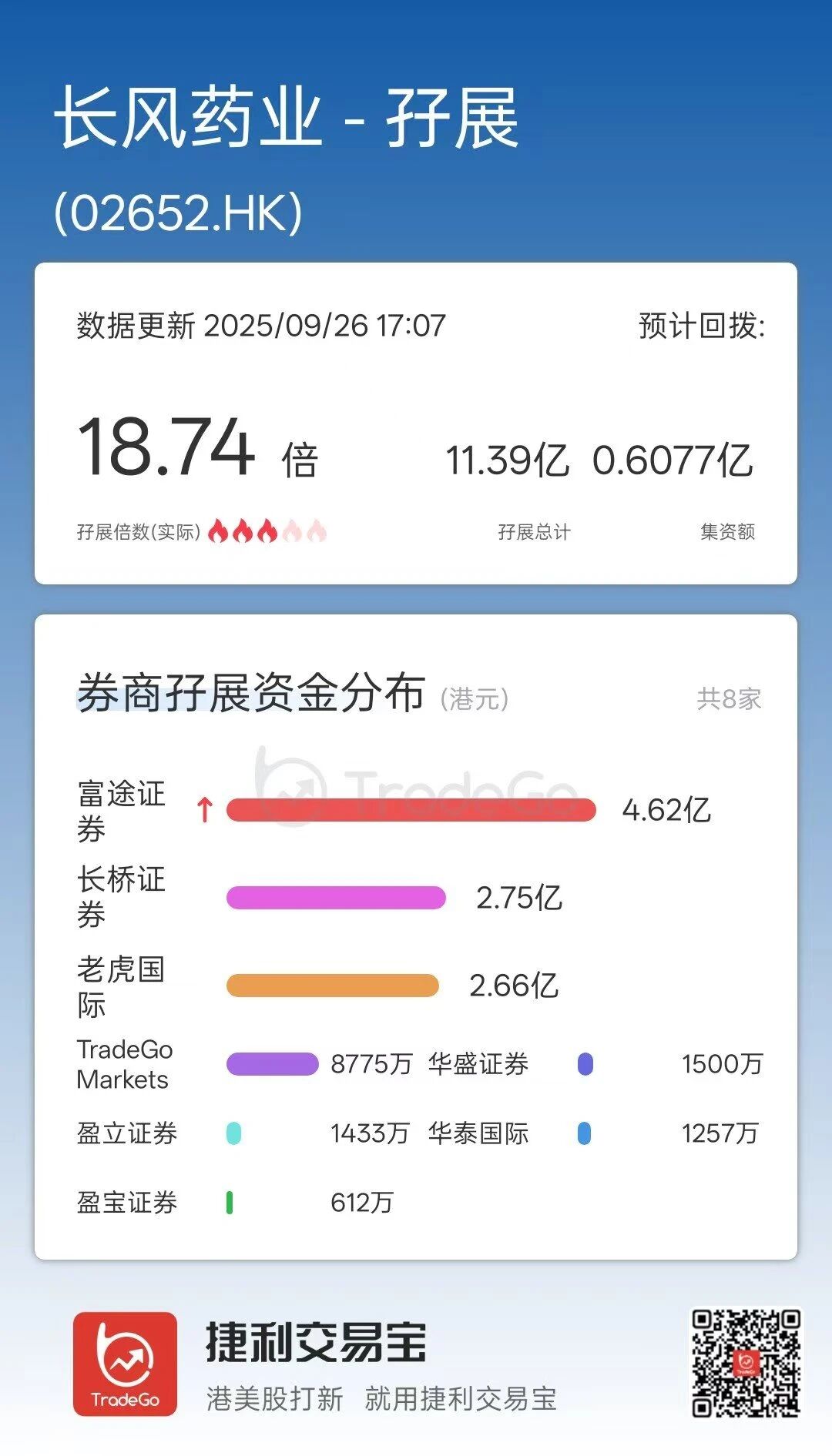 据捷利交易宝的新股孖展数据,截至9月26日17时,长风药业首日的孖展总额约11.39亿港元,孖展认购倍数约18.74倍。其中,富途证券、长桥证券、老虎国际分别放出4.62亿、2.75亿、2.66亿港元。