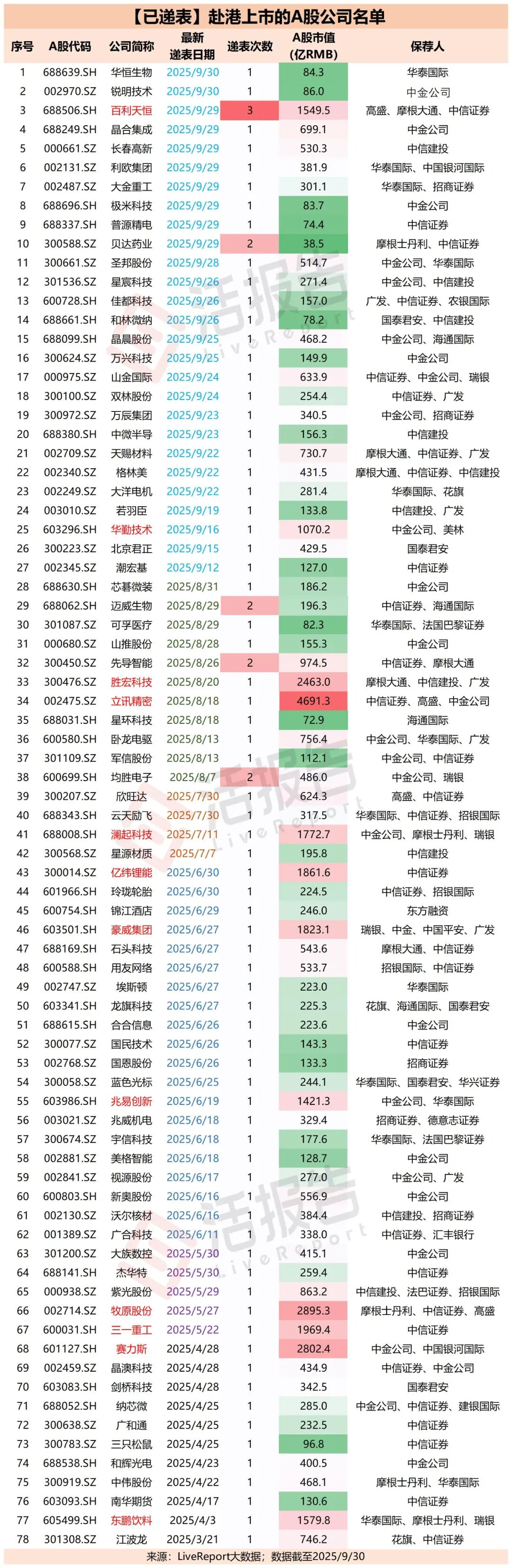 据LiveReport大数据,截至2025年9月30日,9月份已新增27家A股公司递表,今年以来已向港交所递交上市申请、还未上市的A股公司累计达到78家,其中包括立讯精密、牧原股份、赛力斯、胜宏科技、百利天恒等12家超过千亿市值的公司。