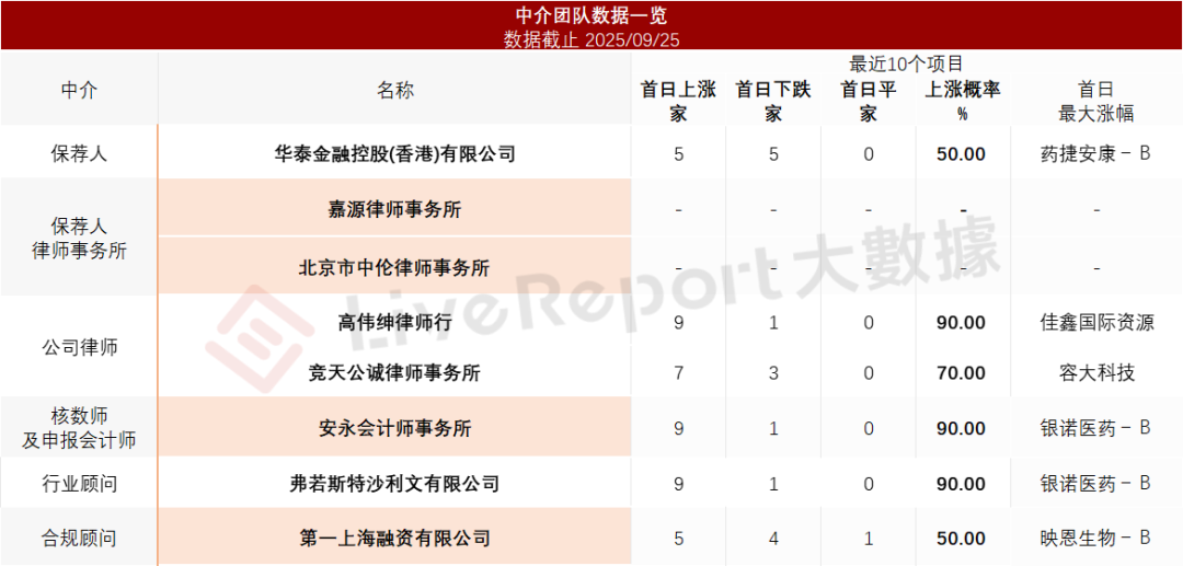 据LiveReport大数据统计,极飞科技中介团队共计8家,其中保荐人1家,近10家保荐项目数据表现平平;公司律师共计2家,综合项目数据表现良好。整体而言中介团队历史数据表现较好。