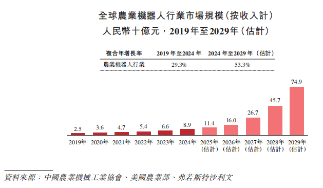 根据弗若斯特沙利文(Frost & Sullivan)的资料,全球农业机器人行业由2019年的人民币25亿元,增长至2024年的人民币89亿元,年均复合增长率29.3%。预计到2029年,全球农业机器人行业市场规模将以53.3%的年均复合增长率增长至人民币749亿元。