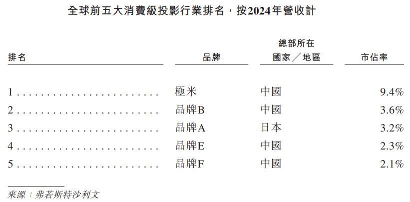 年营收计,极米在全球消费级投影行业中排名第一,市占率达到