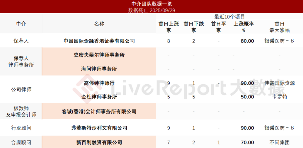 据LiveReport大数据统计,晶合集成中介团队共计8家,其中保荐人1家,近10家保荐项目数据整体表现不错;公司律师共计2家,综合项目数据整体尚可。整体而言中介团队历史数据表现一般。