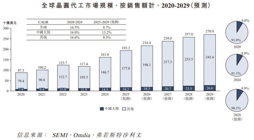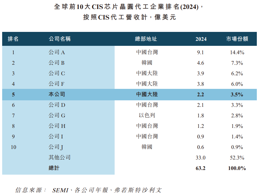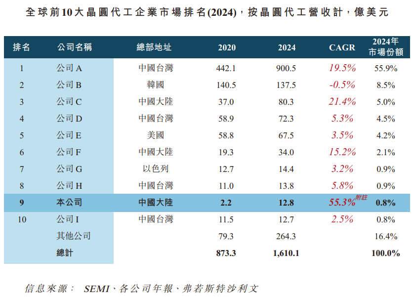 年,按晶圆代工营收计,公司是全球第九大、中国大陆第三大晶圆代工企业,市场份额分别为