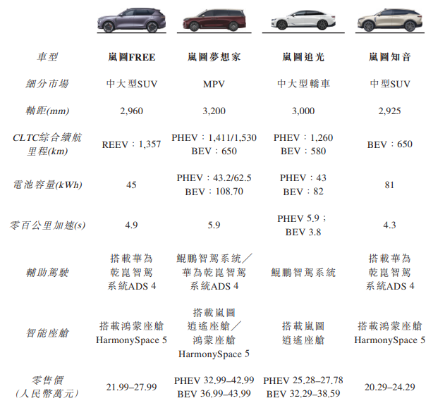 岚图梦想家系列、中大型轿车岚图追光系列和中型