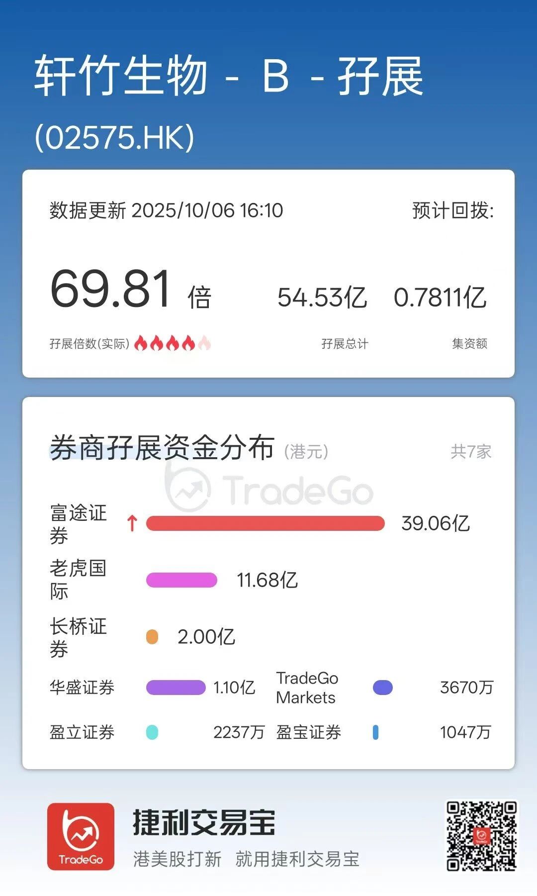 据捷利交易宝的新股孖展数据,截至10月6日16时,轩竹生物-B首日的孖展总额约54.53亿港元,孖展认购倍数约69.81倍。其中,富途证券、老虎国际、长桥证券分别放出39.06亿、11.68亿、2.0亿港元。