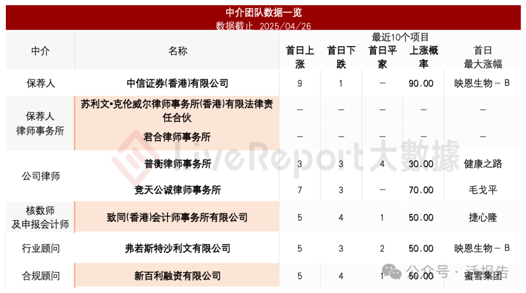 据LiveReport大数据统计,广和通中介团队共计8家,其中保荐人1家,近10家保荐项目数据表现优秀;公司律师共计2家,综合项目数据良好。整体而言中介团队历史数据表现一般。