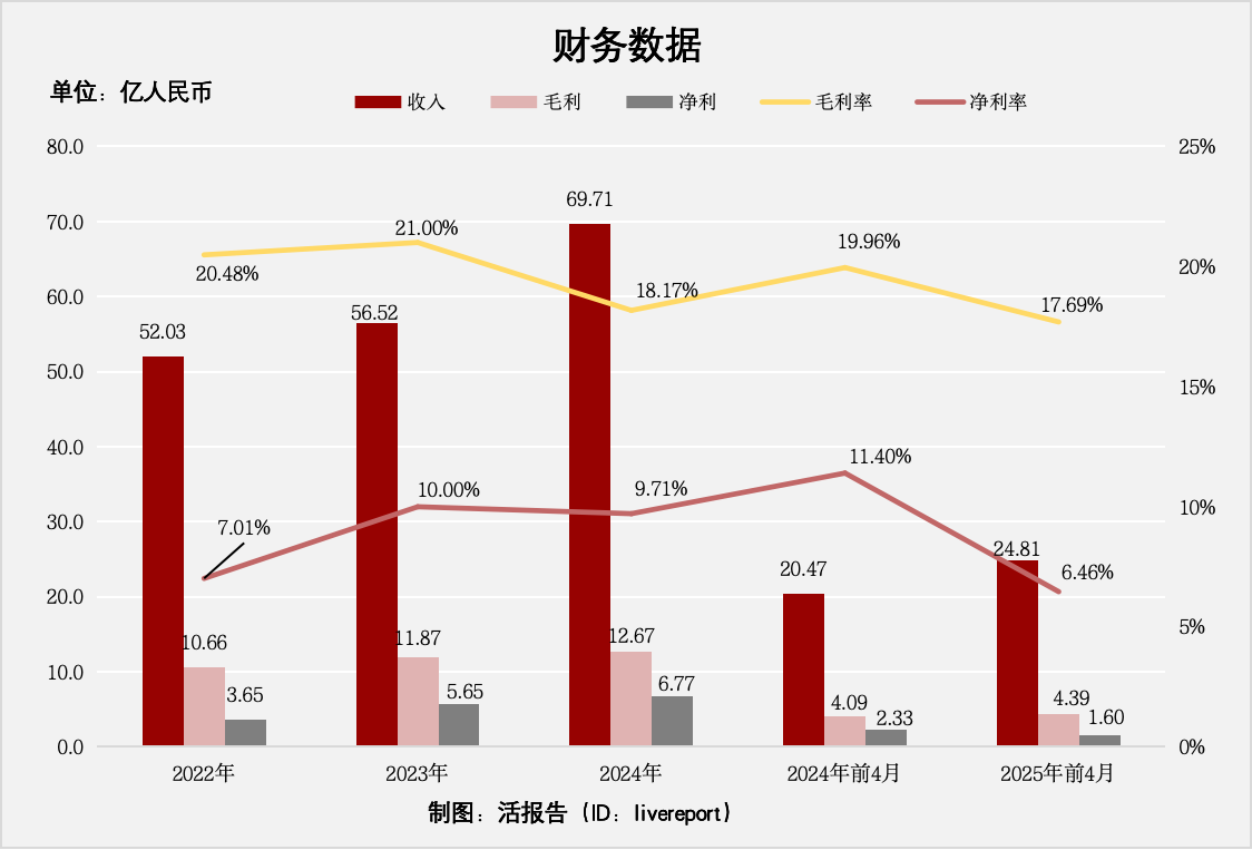 收入分别约为人民币52.03亿元、56.52亿元、69.71亿元、20.47亿元及24.81亿元,年复合增长率为15.75%;
