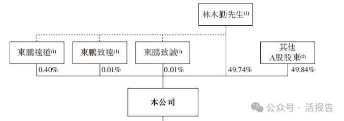 林木勤先生通过东鹏远道、东鹏致远、东鹏致诚持股0.42%,直接持股49.74%,合计50.16%;其他A股股东持股49.84%。