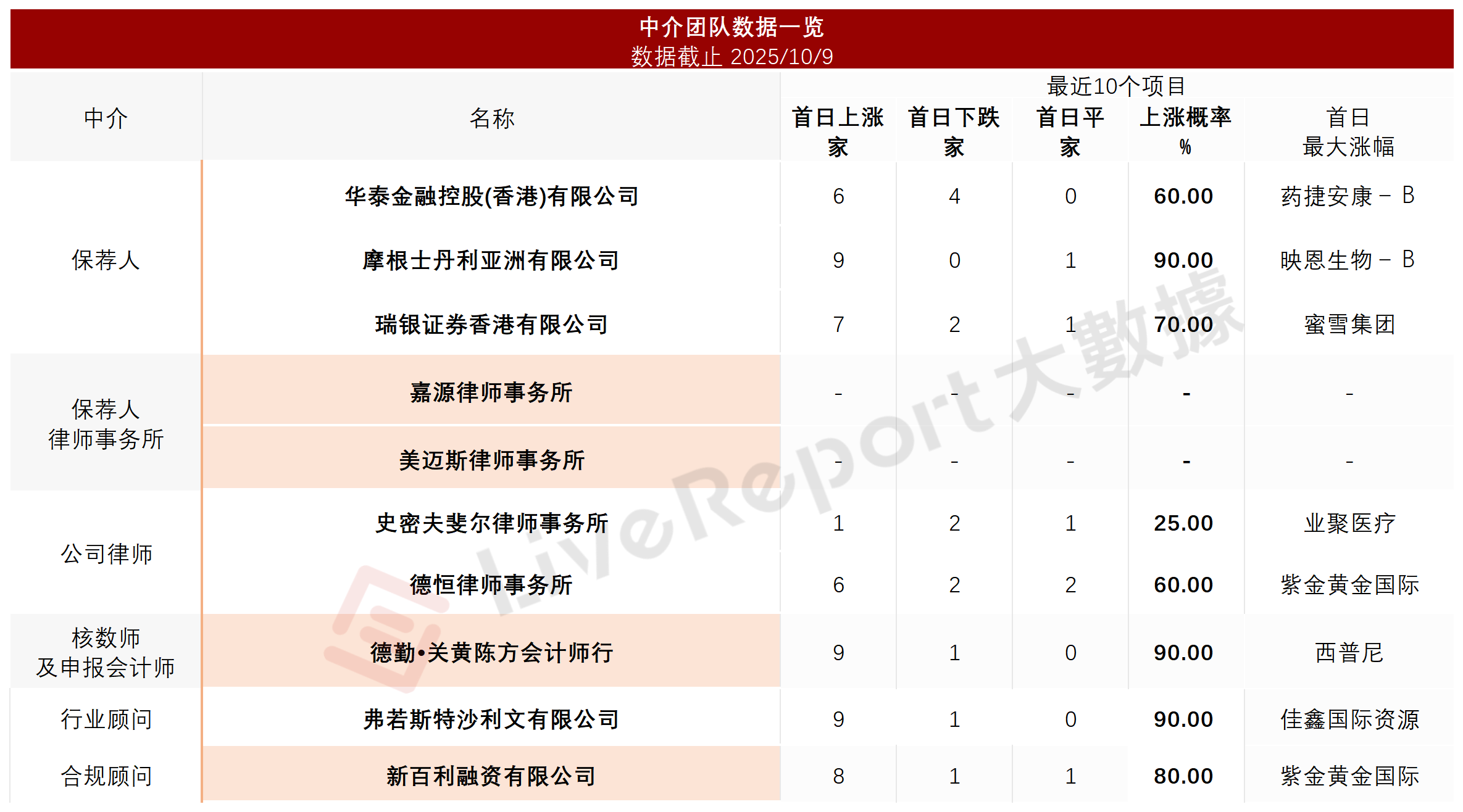据LiveReport大数据统计,东鹏饮料中介团队共计10家,其中保荐人3家,近10家保荐项目数据表现不一;公司律师共计2家,综合项目数据表现欠佳。整体而言中介团队历史数据表现尚可。