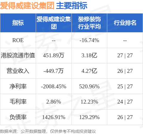 爱得威建设集团港股市值451.89万港元,在装修装饰行业中排名第27。主要指标见下表: