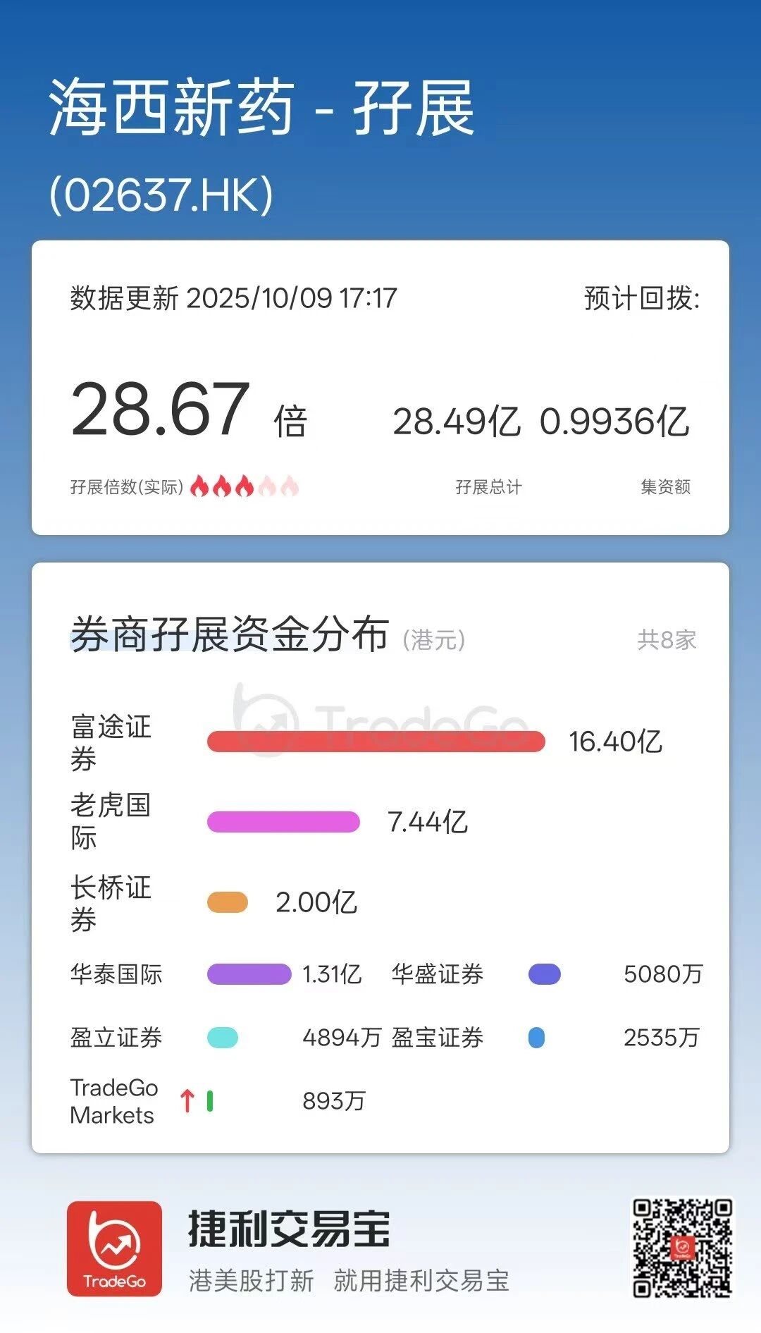 据捷利交易宝的新股孖展数据,截至10月9日17时,海西新药首日的孖展总额约28.49亿港元,孖展认购倍数约28.67倍。其中,富途证券、老虎国际、长桥证券分别放出16.40亿、7.44亿、2.00亿港元。