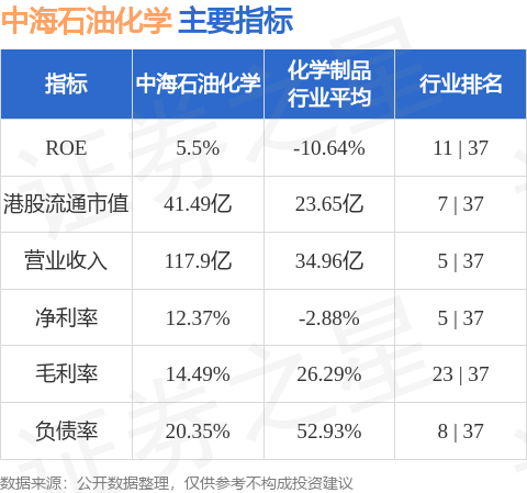 中海石油化学港股市值41.49亿港元,在化学制品行业中排名第7。主要指标见下表: