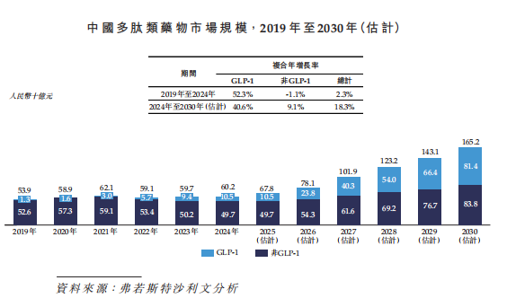 中国多肽类药物市场由2019年的人民币539亿元增至2024年的人民币602亿元,复合年增长率为2.3%,并估计到2030年将达到人民币1,652亿元,2024年至2030年期间的复合年增长率为18.3%。