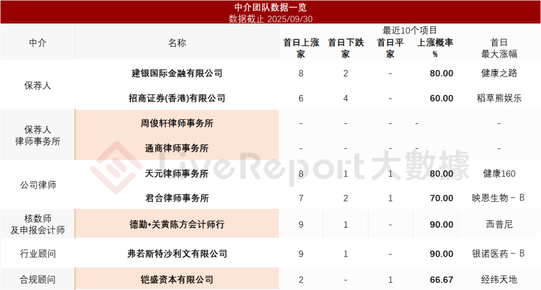 据LiveReport大数据统计,麦科奥特医药中介团队共计9家,其中保荐人2家,近10家保荐项目数据整体表现尚可;公司律师共计2家,综合项目数据整体尚可。整体而言中介团队历史数据表现尚可。