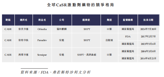 钙敏感受体(CaSR)是一种分布于甲状旁腺、肾脏等组织的G蛋白偶联受体,其核心功能是感知细胞外钙离子浓度的变化,并通过负反馈调节甲状旁腺激素(PTH)的分泌,以维持钙代谢稳态。CaSR激动剂通过与CaSR结合,增强其对细胞外钙的敏感性。截至最后实际可行日期,有两款CaSR激动剂药物获FDA批准,三款CaSR激动剂药物获国家药监局批准。