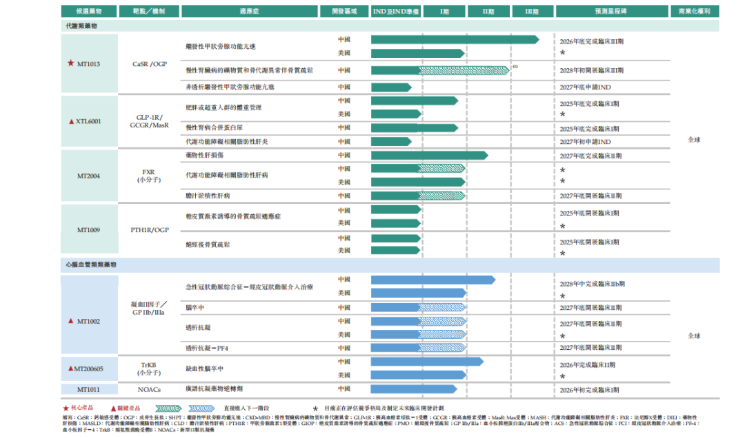 公司成立于2007年,专注于代谢性疾病(尤其是肾脏相关疾病)以及心脑血管疾病,并已自主研发(i)一款核心产品MT1013,其主要适应症为(SHPT),并具备潜力可扩展至慢性肾脏病的矿物质和骨代谢异常(CKD-MBD)伴骨质疏松以及未接受透析的SHPT等额外适应症;及(ii)三项关键产品,即XTL6001、MT1002及MT200605。公司亦正在推进管线中另外三款处于临床阶段的候选产品。