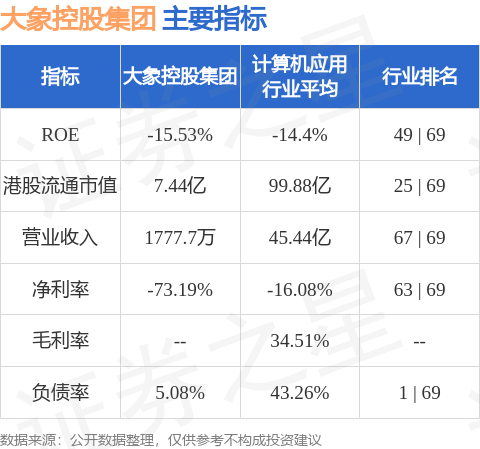大象控股集团港股市值7.44亿港元,在计算机应用行业中排名第25。主要指标见下表: