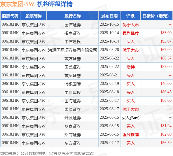 投行对该股的评级以买入为主,近90天内共有8家投行给出买入评级,近90天的目标均价为173.22港元。招商证券最新一份研报给予京东集团-SW强烈推荐评级,目标价183港元。