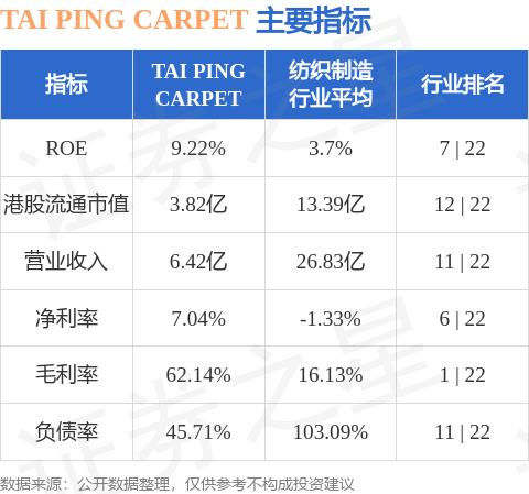 TAI PING CARPET港股市值3.82亿港元,在纺织制造行业中排名第12。主要指标见下表: